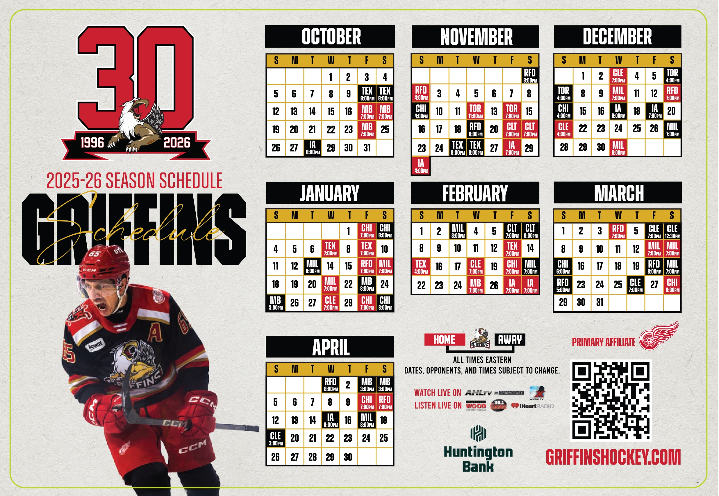 Under third-year head coach Dan Watson, the Griffins will begin the home portion of their 72-game slate on Friday, Oct. 17 against the Manitoba Moose with Opening Night presented by Huntington Bank.